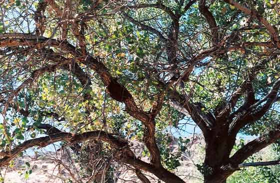 Notice the cluster of honey bees around the brand (slightly left of center). They swarmed onto the branch then worked their way into a tight bunch.