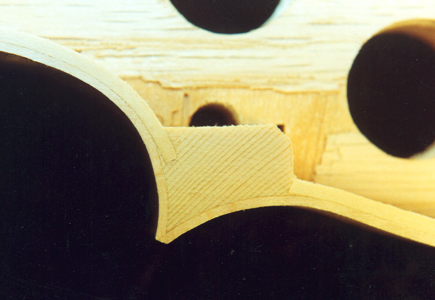 Flatten ribs and linings(closeup of corner mortise). |