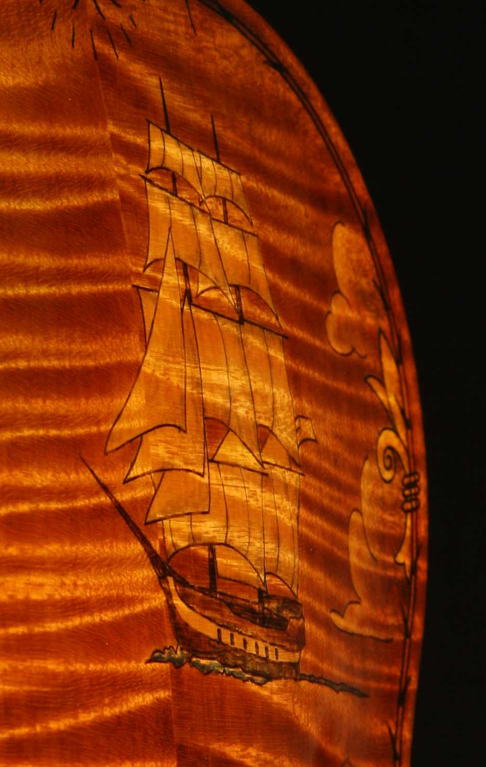 emerging from a storm. Boat anchors adorn each c-bout, flowers are